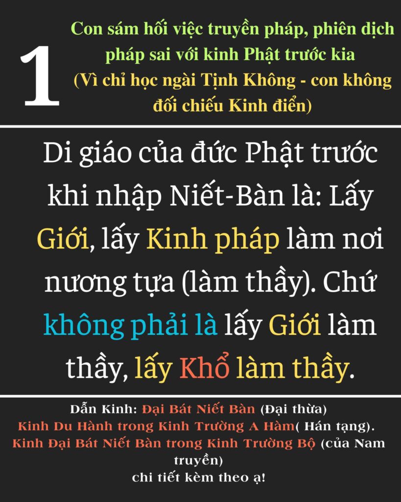 Con trước kia cũng tin và nghe ngài Tịnh Không mười mấy năm, con không có xem nhiều kinh điển nên có sự truyền bá, phiên dịch pháp của ngài Tịnh Không, giảng theo ngài Tịnh Không. Nhưng ba năm nay con đã đọc hệ thống Kinh điển Đại thừa, 4 bộ Kinh A Hàm, 5 bộ Kinh Nikaya, A Tỳ Đàm, nhiều bộ luận khác thì con phát hiện ra có nhiều sai sót trong Pháp trước kia đã học, đã dịch và đã truyền.