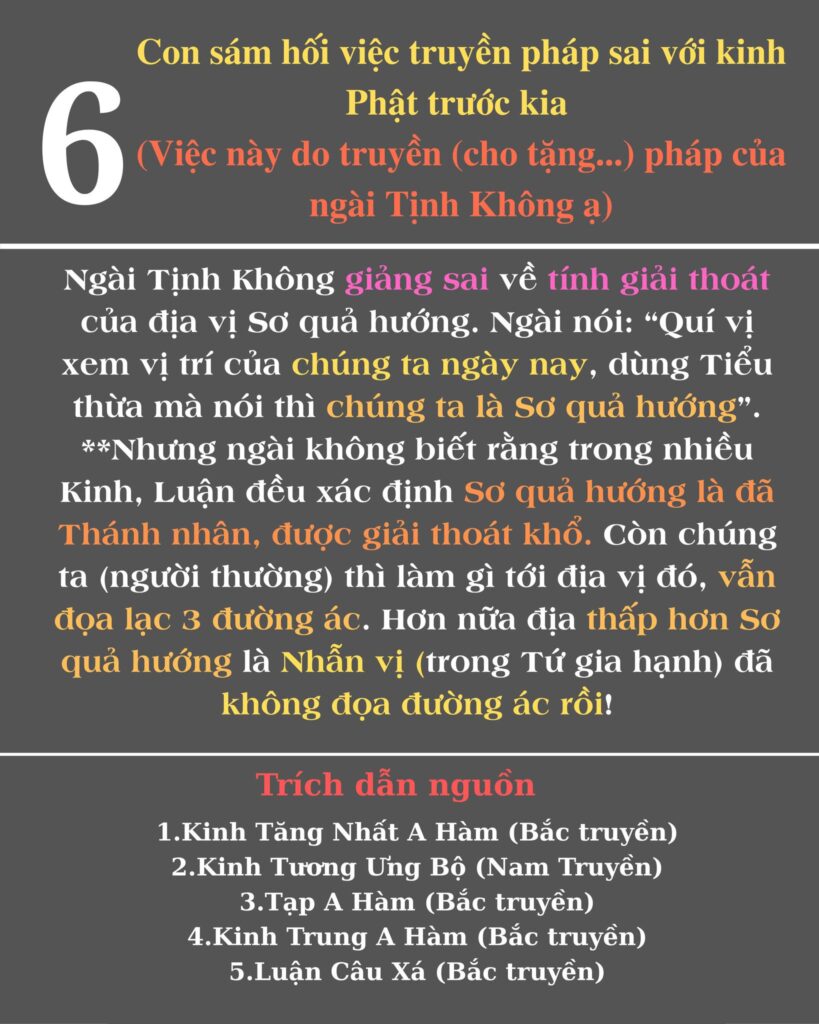 *Vấn đề thứ 6 này là về ‘tính giải thoát của địa vị Thánh nhân Sơ quả hướng’ (còn gọi là Tu-đà-hoàn hướng hay là hướng Tu-đà-hoàn) – đây là địa vị quan trọng vì nhận thức đúng thì sự tu tập giải thoát mới có thể có tinh thần đúng. Nhưng rất tiếc ngài Tịnh Không đã nói sai, ngộ nhận rằng ‘chúng ta thuộc địa vị này’. Trong khi ‘địa vị Sơ quả hướng’ đã là Thánh nhân không còn đọa lạc, được đức Phật xếp vào hàng Tăng bảo. Con xin trích như sau: